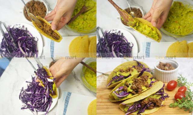 - Thêm 1 thìa thịt bò băm vào vỏ bánh đã chuẩn bị, tiếp đến là 1 lớp sốt bơ và rau cải tím cắt nhỏ. Bạn có thể trang trí chiếc bánh Tacos tùy theo sở thích bằng cách thêm phần thịt hoặc phần sốt nhiều hơn