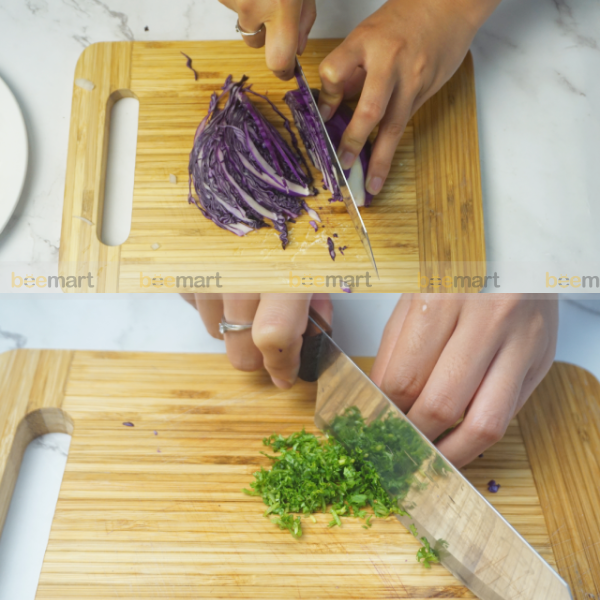 - Bắp cải tím cắt thành lát nhỏ, rau mùi băm nhuyễn. Tỏi lột vỏ, để riêng. Chỉ cần dùng khoảng 1/2 củ tỏi để tránh làm phần sốt bị nồng