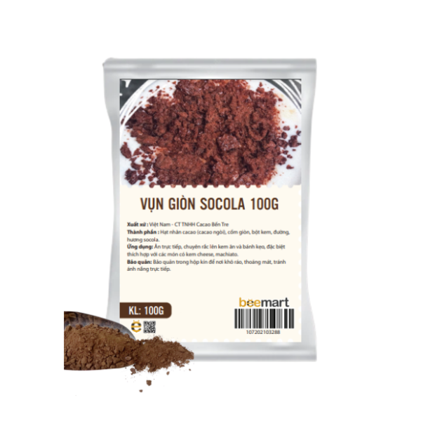 Vụn giòn socola nhìn qua có vẻ giống bột socola sữa hây bột socola đắng tuy nhiên thành phần bột này lại là hạt nhân cacao (cacao ngòi), cớm giòn, bột kem, đường và hương socola tự nhiên. Chính vị vậy khi thưởng thức bạn sẽ cảm nhận được độ giòn tan hương vị ngọt thanh, béo ngậy hậu vị hơi đắng nhẹ.