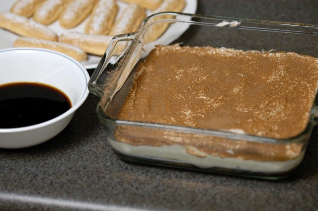 - Bước 4: Bạn chuẩn bị sẵn bánh champagne, nhúng qua một lớp cà phê espresso rồi xếp ra khay. Phết 1 lớp kem lên, sau đó lặp lại trình tự với bánh champagne và kem thêm 2 lần nữa.