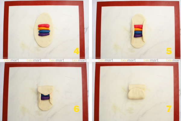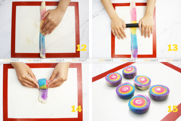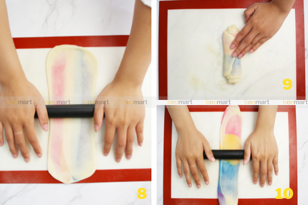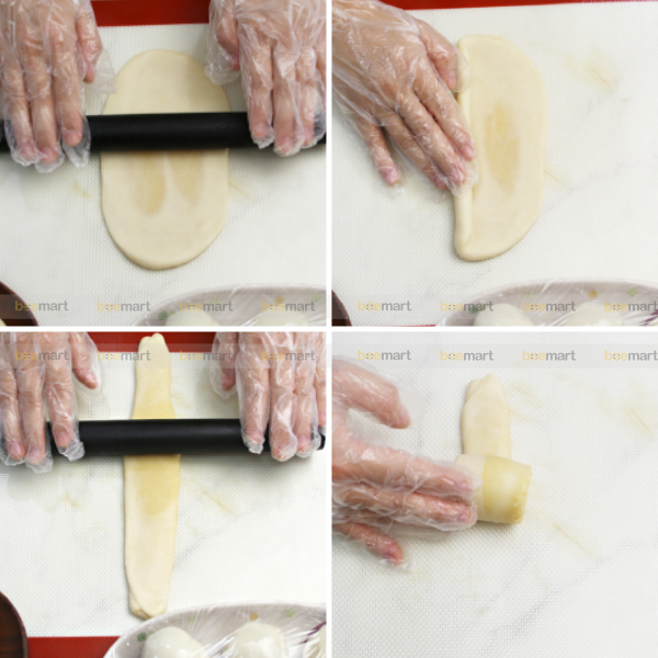 Cuộn bột lại và cán mỏng thêm 1 lần nữa. Thao tác các bước như hình.