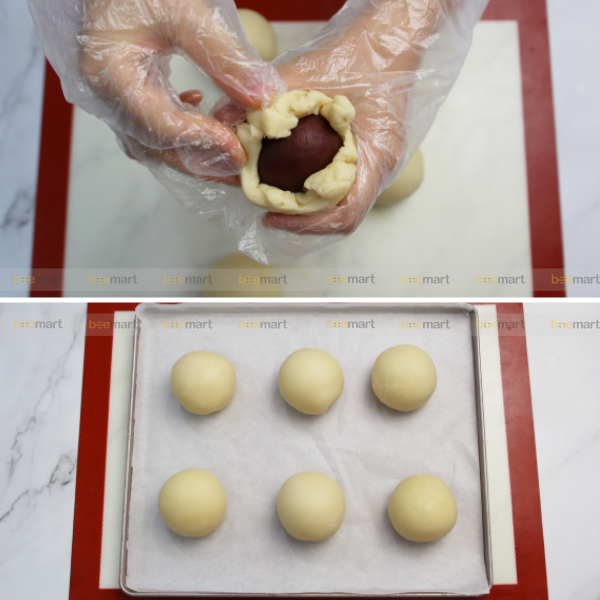 Tiếp đến nhấn dẹt phần bột vỏ, đặt phần bột ruột vào giữa rồi vo tròn lại sao cho bột vỏ phủ kín phần bột ruột.