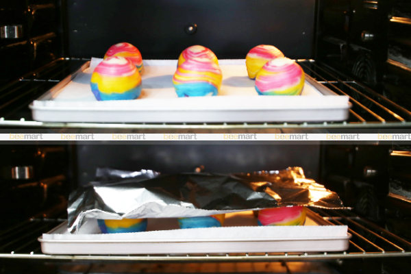 Làm nóng lò ở nhiệt độ 180 độ trong 15 phút. Sau đó nướng bánh ở nhiệt độ 180 độ trong 20 phút. Tuy nhiên để tránh bị xém màu trong quá trình nướng, bạn cần chuẩn bị giấy bạc che mặt bánh nhé.