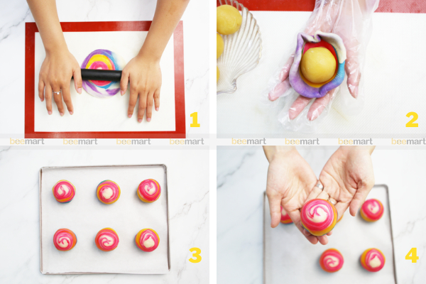 Lưu ý, trong quá trình làm bạn cần dùng màng thực phẩm bọc các phần bột chưa dùng đến để tránh bị khô nhé!