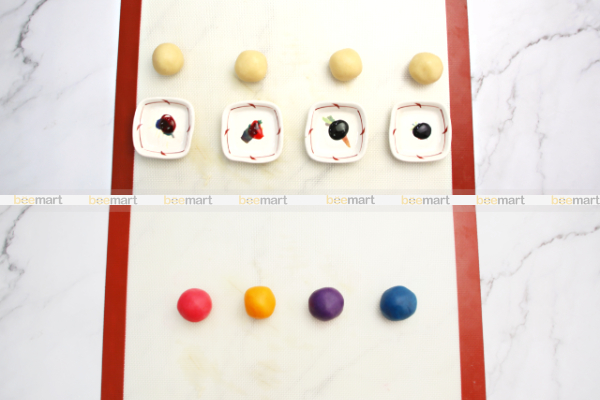Bạn chia phần bột ruột bánh thành 4 phần bằng nhau tương ứng với 4 màu. Sau đó trộn từng màu với từng bột. Bạn có thể pha màu đậm nhạt theo sở thích.