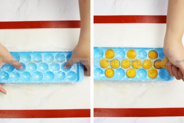 Lót màng bọc thực phẩm vào khuôn thạch hoặc khay đá.