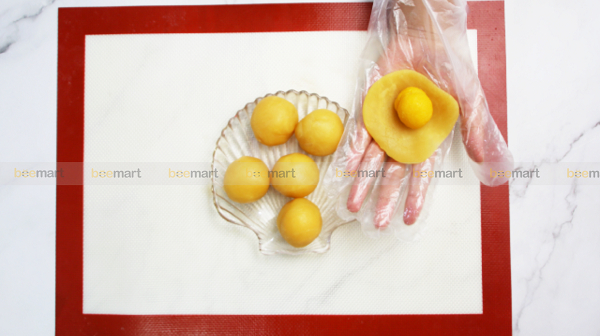 Dùng tay ấn dẹt nhân đậu xanh, sau đó đặt nhân lava vào giữa rồi nhẹ nhàng bao kín lại sao cho nhân đậu xanh bọc kín lava trứng muối.