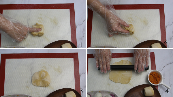 Ấn dẹt cục bột rồi bán mỏng ra. Lưu ý không nên cán quá mỏng có thể làm bục phần nhân trong lúc nướng.