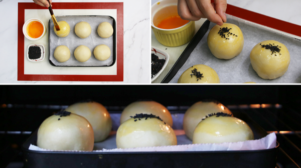 Sau lần 1 lấy bánh ra, để bánh nguội bớt rồi phết 1 lớp mỏng lòng đỏ trứng đánh tan, rắc thêm vừng lên mặt bánh.