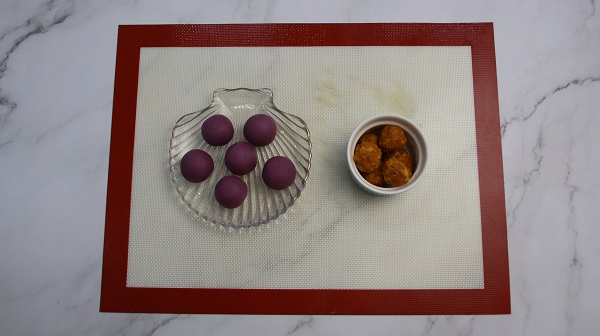 - Chia 120g nhân khoai lang thành 6 phần bằng nhau (20g/ phần), vo tròn.