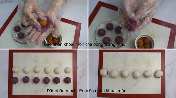 - Đặt phần nhân mochi khoai môn lên trên rồi nhẹ nhàng gói phần vỏ bánh lại sao cho bột phủ kín nhân.