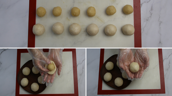Chia phần bột ruột và bột vỏ thành 6 phần bằng nhau và vo tròn.