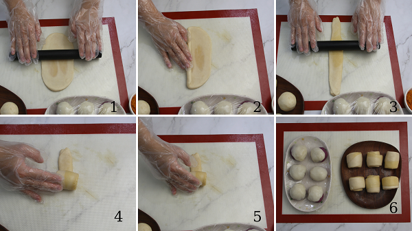Cuộn bột lại và cắt đôi phần bột vừa cuộn mình sẽ được 6 phần vỏ bánh.