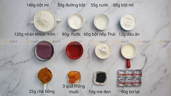 Nếu bạn lo lắng có quá nhiều nguyên liệu cần phải chuẩn bị, thì đừng lo, Beemart có Set nguyên liệu làm bánh trung thu Đài Loan 3Q Khoai môn tiện lợi. Các nguyên liệu được cân đong với tỉ lệ chính xác, đảm bảo công thức thành công, bạn có thể tham khảo tại đây nhé!!!