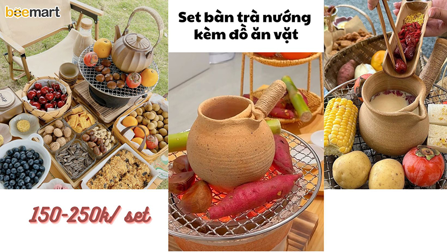 Điểm thú vị của set này chính là sự kết hợp giữa món trà truyền thống (bạn có thể dùng trà thảo mộc, trà hoa hoặc trà sữa nướng) và các loại đồ ăn vặt nướng trên bếp như khoai, bánh dẻo, trái cây sấy dẻo, các loại hạt,...